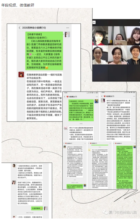 西林幼开启以“保教质量”为抓手的“3+1+1”《幼儿园保教质量监控指导手册》的学习,进一步提升教师教学技能;"3"指的是全体教师在幼儿园教学部门提出研修任务,根据教研目标开展了卫生保健与安全质量、教育环境质量、课程质量、自主游戏质量等相应项目板块的为期三天的自我学习。第一个“1”以年段为单位进行一次在线云研讨,并收集研讨中遇到的问题与困惑。第二个“1”指教学部门根据各年段收集来的教研问题及困惑,与老师共聚线上,再一次进行线上专题研修活动。