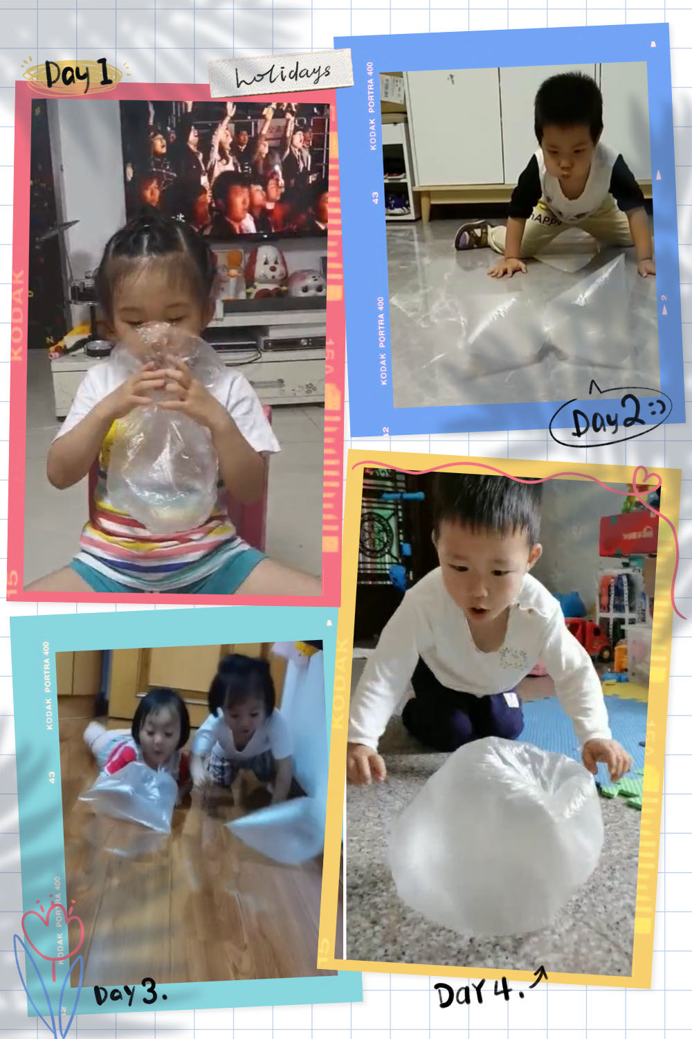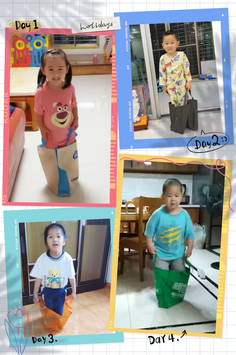 在使用袋子进行花样游戏的过程中,孩子们不仅享受了玩袋子的乐趣,还发展了肌肉动作,居家也能快乐锻炼增强体质呢!