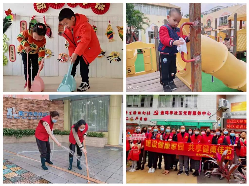 为全面贯彻落实爱国卫生运动精神,让幼儿从小养成爱清洁、讲卫生的好习惯,树立健康强国理念,营造干净整洁、健康祥和的节日氛围,西林幼儿园结合我国传统节日“春节”的习俗开展了“‘疫’尘不染,辞旧迎新”爱国卫生运动。孩子们热火朝天,老师们也干劲十足。春节前夕,幼儿园教职工扫垢除尘、全面消杀,从“细”开始,从“微”着手,积极筑牢校园防疫卫生线,全力打造一个干净、整洁、健康的幼儿园环境。为美化社区,发扬志愿服务精神,我园党支部、团支部还积极参加社区“洁净家园”活动,以实际行动为社区居民服务,共建和谐文明家园。
