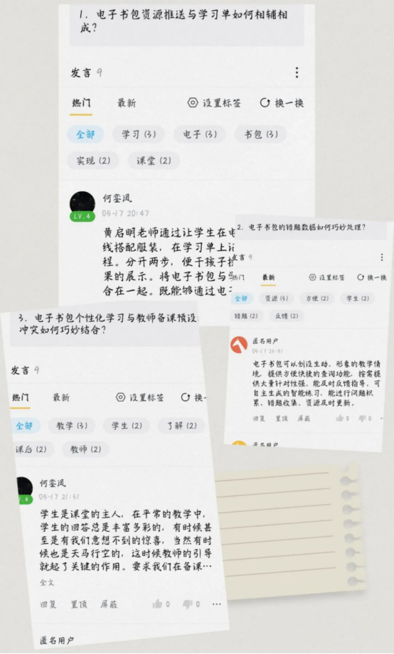在现场研讨之余,与会教师还在线上研讨区围绕“电子书包资源推送与学习单如何相辅相成?”“电子书包的错题数据如何巧妙处理?”“电子书包个性化学习与教师备课预设的冲突如何巧妙结合?”问题进行研讨。