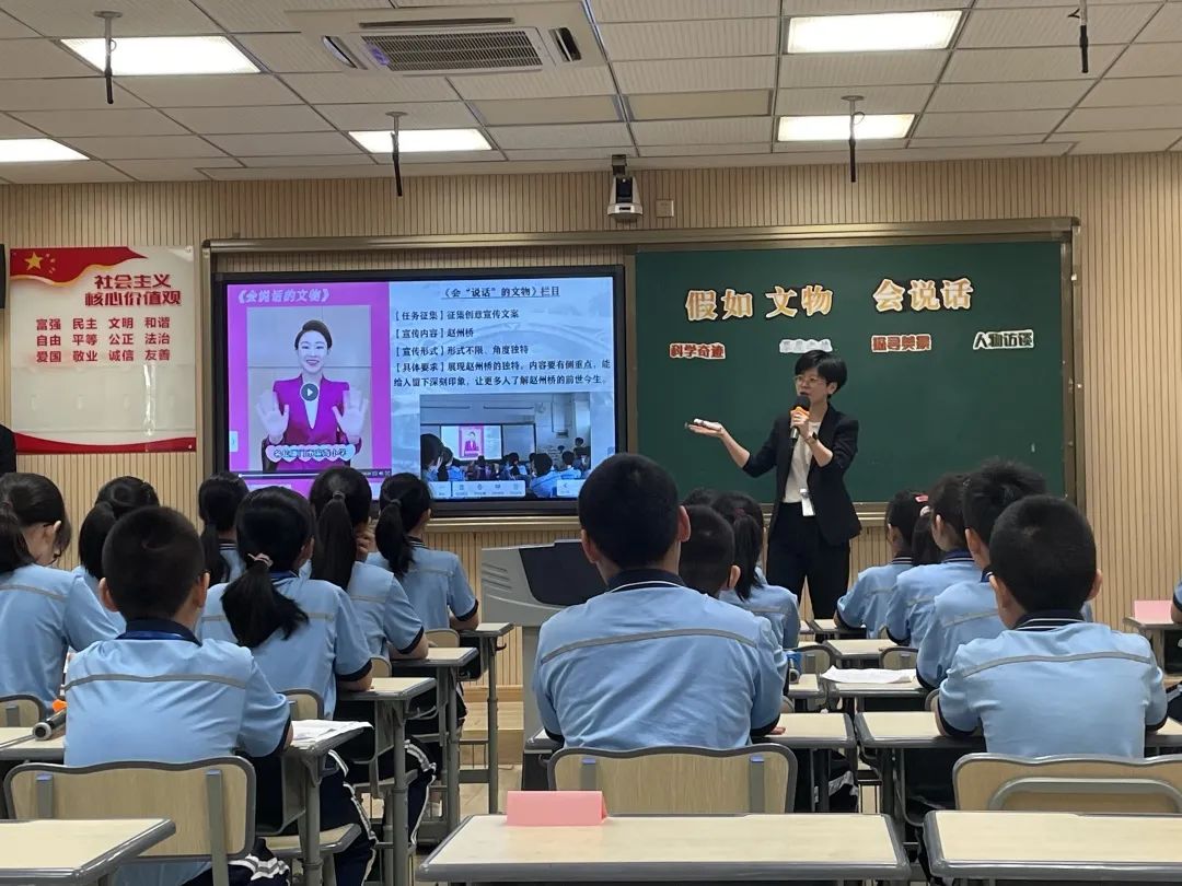 第二节习作课《假如文物会“说话”》由滨海小学的王筱韵老师执教。在前一节科学课的基础上,王老师通过任务驱动,带领学生化身节目编导,分组创编赵州桥宣传文案,在探究、表达的同时,提升了学生的文化自信。本课在《拱形的力量》基础上发展学生策划、阅读、表达等能力,充分体现了STEM的教育理念。