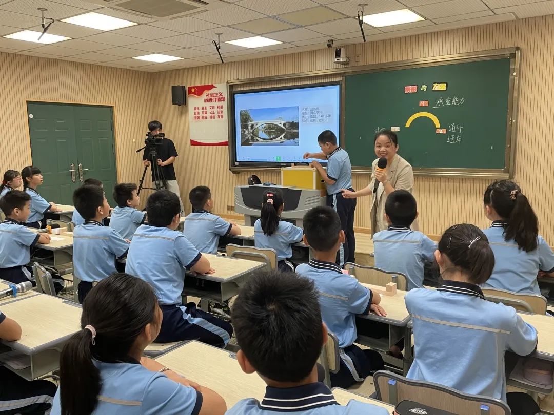 第一节科学课《拱形的力量》由滨海小学孙娜老师执教,采用层层递进的方式,引导学生探究7种不同高度的拱形的承重能力,借助电子书包收集处理分析数据。在此基础上,重点启发学生讨论李春在建造赵州桥时综合考虑的因素。最后,赵州桥模型的展示和承重力测试将课推向了高潮。